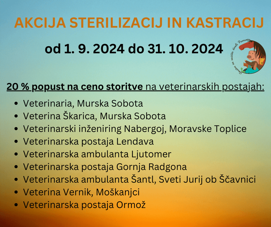V tem času imate na vseh veterinarskih postajah v Pomurju in tudi širše (Moškanjci, Ormož) možnost sterilizirati in kastrirati pse in mačke (ponekod še kunce) z 20% popustom na ceno storitve.